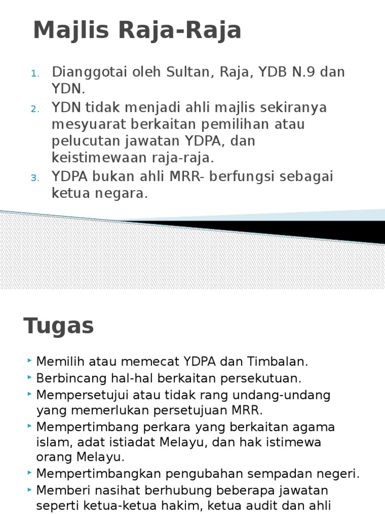 View Keahlian Sejarah Majlis Raja-raja Melayu - Aliff Zikry 2019414428docx from HPD 134 at Universiti Teknologi Mara. Semua Raja dan Yang di - Pertua Negeri secara automatik menjadi Ahli Majlis Raja - Raja. Mesyuarat Majlis Raja-Raja yang pertama selepas merdeka telah diadakan pada 30 dan 31 Oktober 1957 dan dipengerusikan oleh DYMM Sultan Syed Putra ibni Almarhum Syed Hassan Jamalullail Raja.